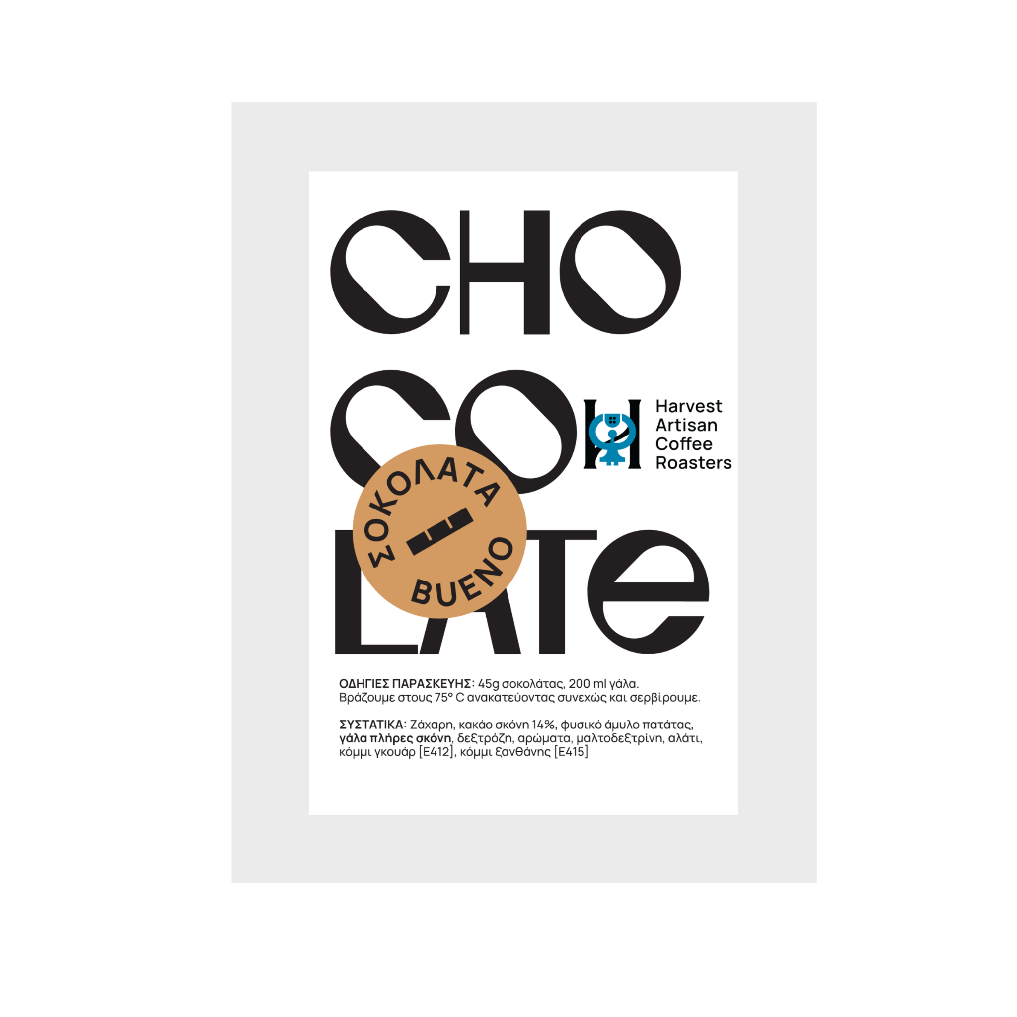 Ζάχαρη, κακάο σε σκόνη (14%), φυσικό άμυλο πατάτας, γάλα πλήρες σε σκόνη, δεξτρόζη, αρώματα, μαλτοδεξτρίνη, αλάτι, κόμμι γκουάρ (E412), κόμμι ξανθάνης (E415).
